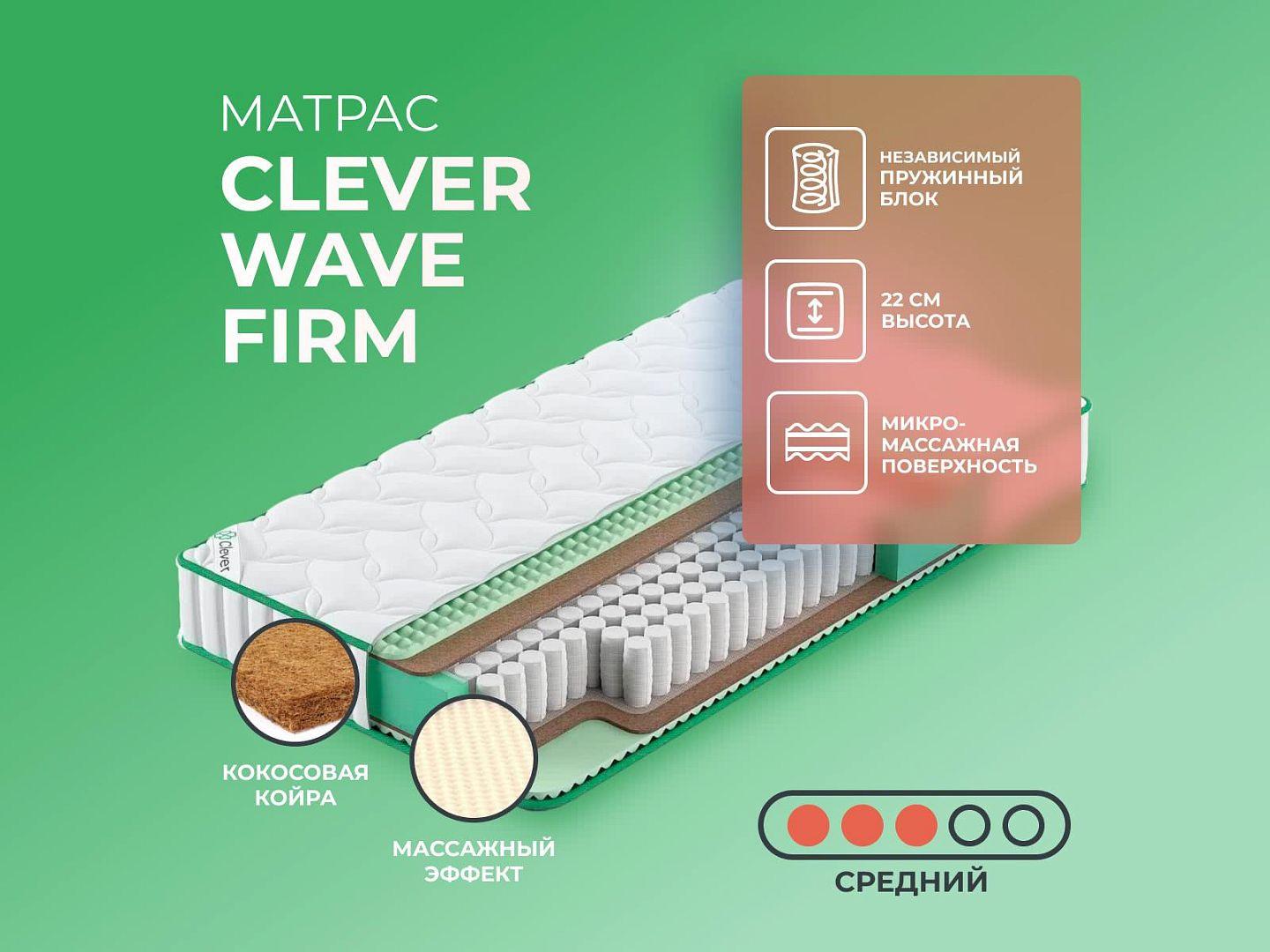 Фабрика Clever получила заслуженную репутацию, благодаря применению новых технологий и безупречному соблюдению стандартов качества. Clever Wave Firm — образец продукта с лучшими характеристиками и доступной ценой, матрас создан из дышащих тканей, с эффектом вентиляции.
