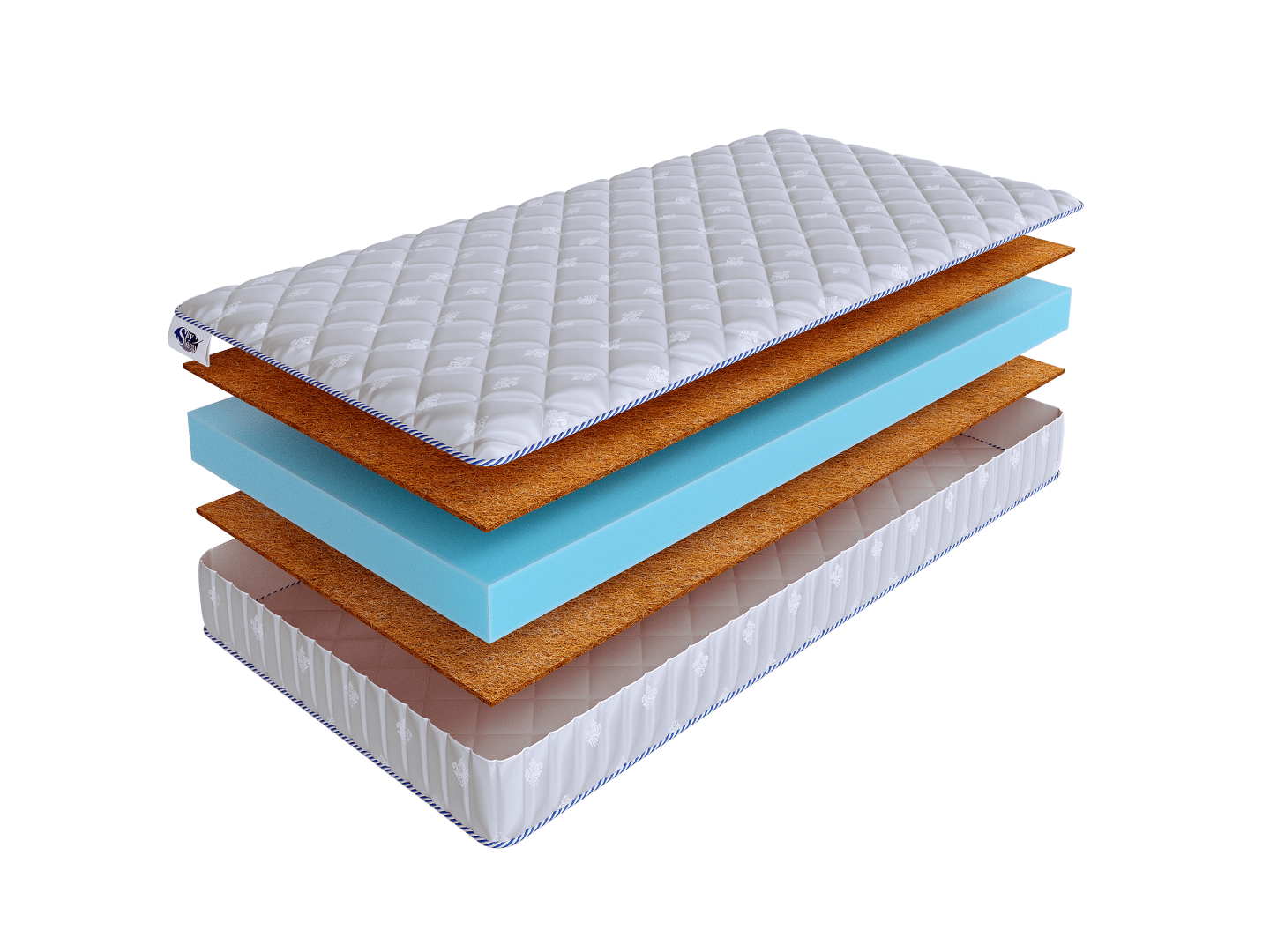 Слой кокосовой койры, расположенный с двух сторон матраса, придает поверхности жесткость и упругость, обеспечивает ортопедичность спального места.