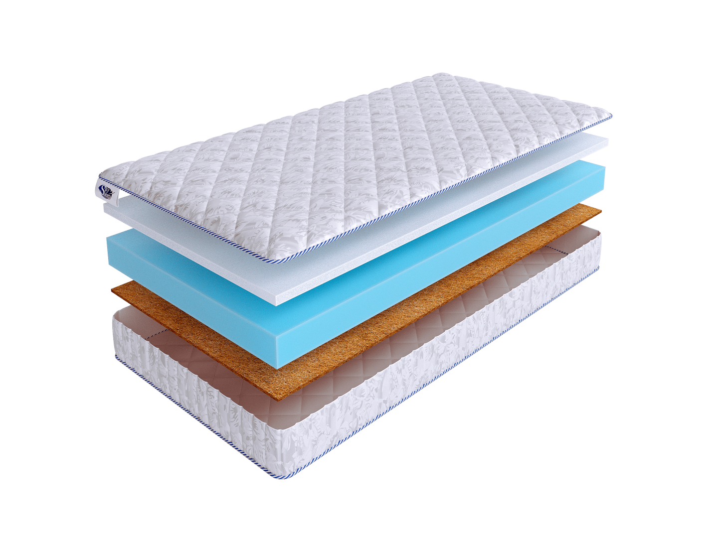 Матрас обладает умеренно-высокой жесткостью сторон. Одна сторона изготовлена из слоя кокосовой койры толщиной 1 см, а вторая из слоя холлофайбера.
