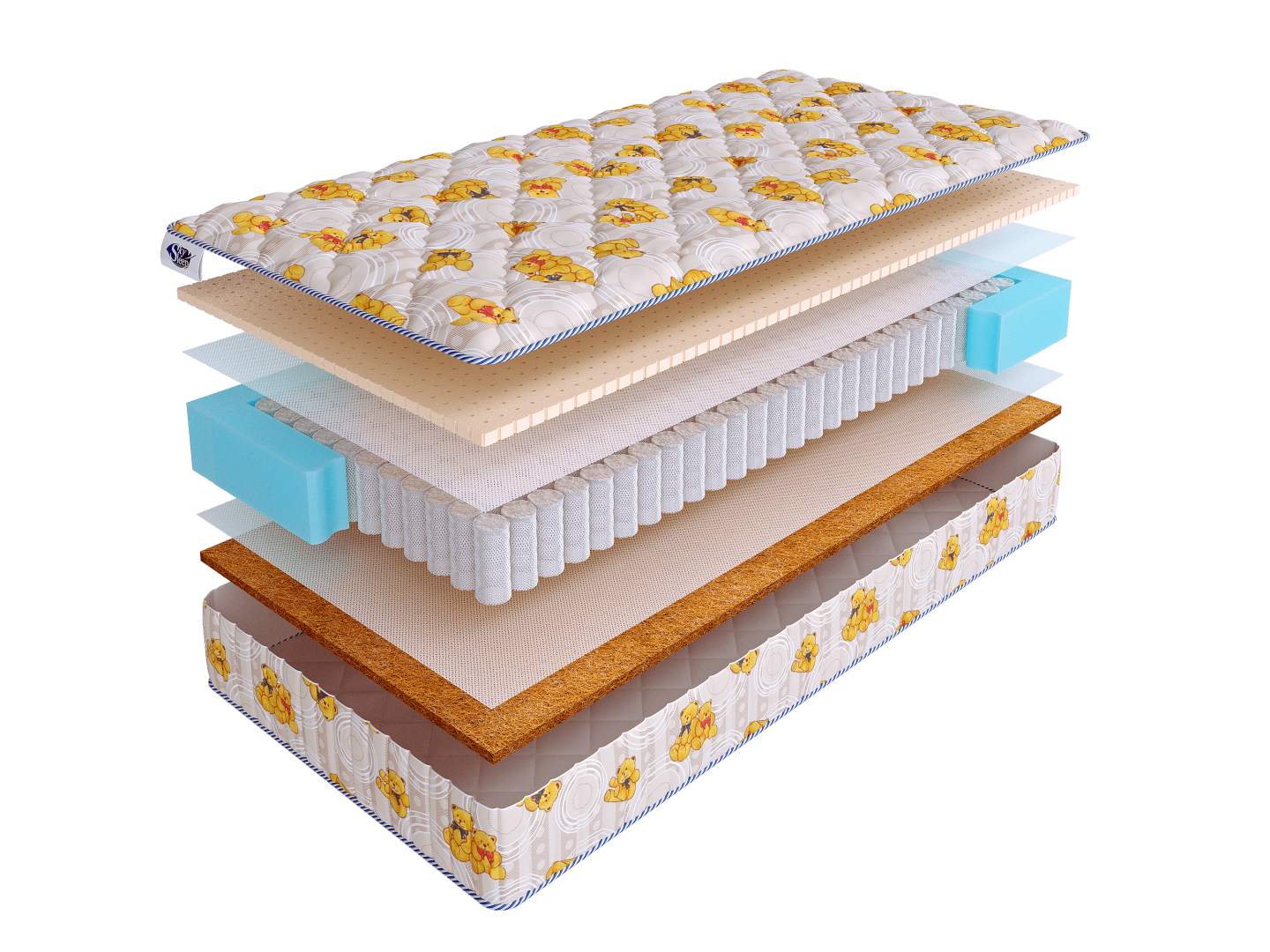 Чехол матраса выполнен их поликоттона с детским рисунком и простеган на гипоаллергенном волокне.