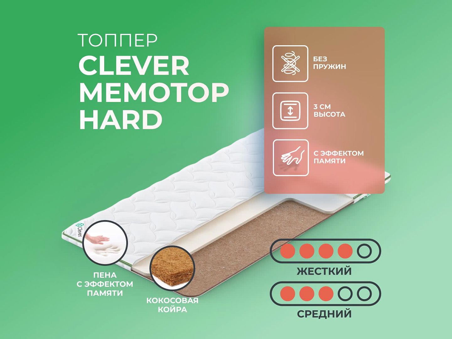 Фабрика Clever получила заслуженную репутацию, благодаря применению новых технологий и безупречному соблюдению стандартов качества. Топпер Clever MemoTop Hard — образец продукта с лучшими характеристиками и доступной ценой, матрас создан из дышащих тканей, с эффектом вентиляции.